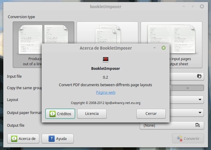 El programa tiene interfaz gráfica y lo puedes iniciar desde el lanzador de aplicaciones buscándolo por su nombre. Tiene varias funciones, la que más nos interesa es la primera, que coge un PDF de una página y la convierte en un formato ideal para imprimir como si fuera un folleto. Sólo quedaría enviarlo a la impresora para que se imprima a doble cara, y todo listo.