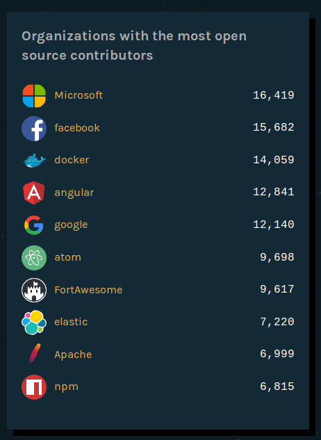 Y antes de que me tiréis piedras, no os asustéis. El blog sigue hablando de software. Este es el ejemplo comercial que más familiar nos puede parecer al que lleva a cabo Microsoft. Esa multinacional que de la noche a la mañana pasó de odiar Linux a amarlo, y a poder instalarlo dentro del propio Windows. Esa multinacional que se ha puesto a amar el software libre y que contra todo pronóstico lidera el ranking de empresas con más contributores de código de software libre en github (mirror).