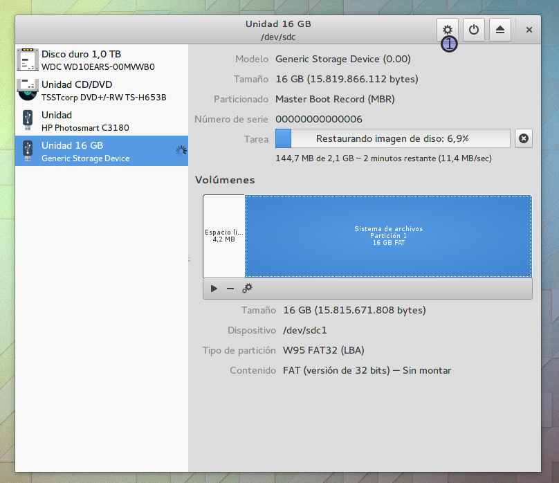 Ahí se nos pedirá una ruta para el archivo (.img). Se lo proporcionamos y, después de poner la contraseña root, pues nos mostrará gentilmente el progreso que lleva. Esto último es de gran ayuda con respecto al comando «dd», el cual no nos provee de dicha información.