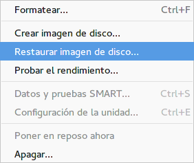Gnome Discs (también conocido como «discos» a secas) permite simplificar esta tarea y ayudarte con una interfaz gráfica. Simplemente abrimos la aplicación y nos vamos al dispositivo al que queramos meterle la imagen. Vamos a la ruedecita (#1 en la imagen superior) y seleccionamos la opción de «Restaurar imagen»: