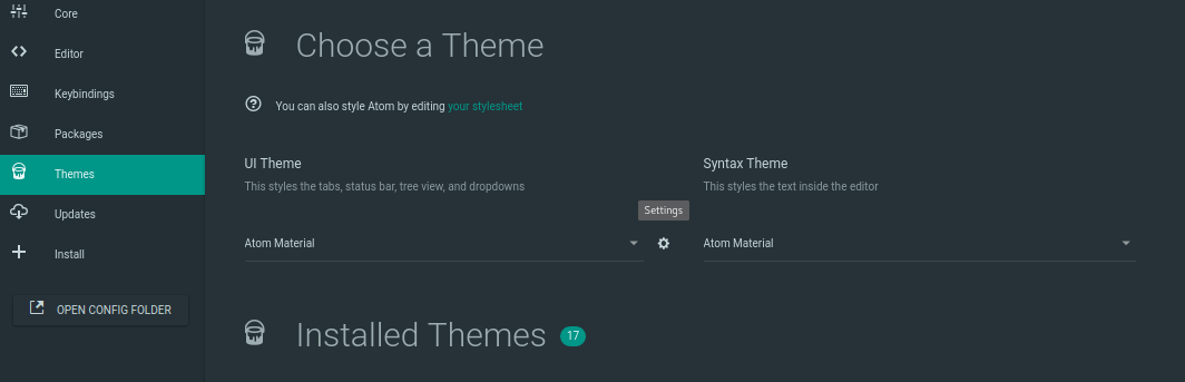 El tema que, personalmente, más me gusta es Atom Material. Podemos instalarlo abriendo la configuración y yendo a la parte de Install. Allí, seleccionamos al lado del cuadro de búsqueda la opción de Themes y escribimos atom-material-ui, lo instalamos y buscamos también atom-material-syntax. Ahora vamos a la pestaña Themes y seleccionamos Atom Material tanto a la izquierda como a la derecha.
