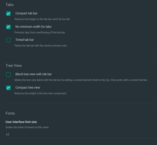 En mi caso, voy a seleccionar tanto «Compact tab bar» como «Compact tree view», y más abajo pondré el tamaño de fuente a 12, en vez de el valor por defecto (14).
