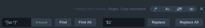 En el cuadro de búsqueda pondremos entre dos comillas simples nuestra expresión regular (\w.*), que quiere decir buscar cualquier número de palabras. En el cuadro de reemplazar, pondremos la variable que hemos encontrado $1 entre comillas dobles, consiguiendo así reemplazar lo que queremos.