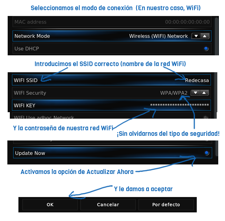Ahora se nos abre una ventana, y tendremos que seleccionar Wi-Fi como medio de conexión. La gracia dificultad de configurar el Wi-Fi es que no nos va a realizar un escaneo de las redes, por lo que debemos conocer hasta el SSID correctamente (mayúsculas incluidas). Introducimos los datos: SSID y contraseña, y le damos abajo a Update Now. Acto seguido, le podremos dar a salir.