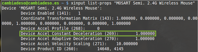 cambiadeso@cambiadeso.es ~ $ xinput ⎡ Virtual core pointer id=2 [master pointer (3)] ⎜ ↳ Virtual core XTEST pointer id=4 [slave pointer (2)] ⎜ ↳ MOSART Semi. 2.4G Wireless Mouse id=10 [slave pointer (2)] ⎜ ↳ Atmel Atmel maXTouch Digitizer id=12 [slave pointer (2)] ⎜ ↳ ETPS/2 Elantech Touchpad id=15 [slave pointer (2)] ⎣ Virtual core keyboard id=3 [master keyboard (2)] ↳ Virtual core XTEST keyboard id=5 [slave keyboard (3)] ↳ Power Button id=6 [slave keyboard (3)] ↳ Video Bus id=7 [slave keyboard (3)] ↳ Video Bus id=8 [slave keyboard (3)] ↳ Sleep Button id=9 [slave keyboard (3)] ↳ USB Camera id=11 [slave keyboard (3)] ↳ Asus WMI hotkeys id=13 [slave keyboard (3)] ↳ AT Translated Set 2 keyboard id=14 [slave keyboard (3)]